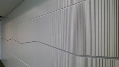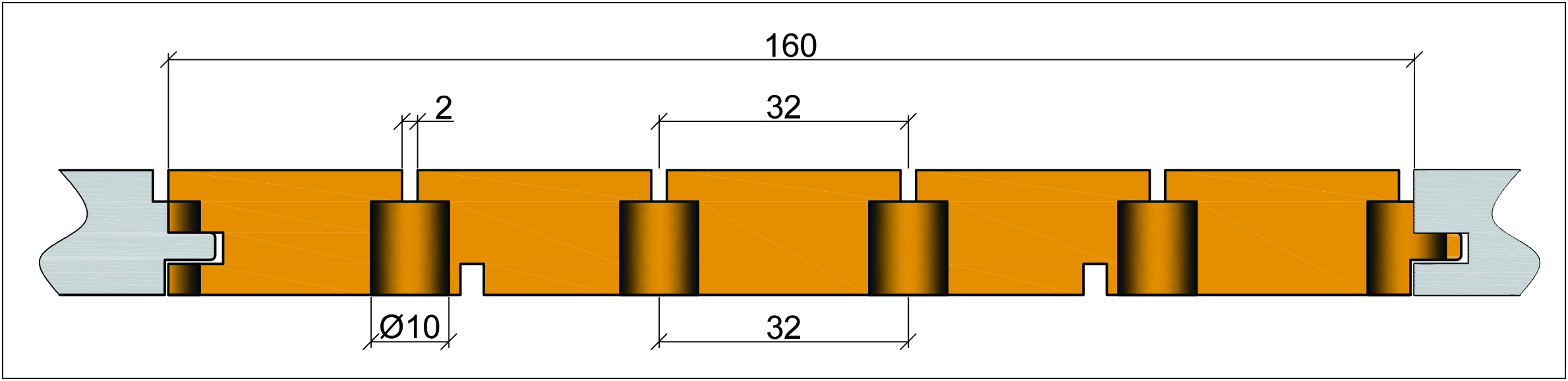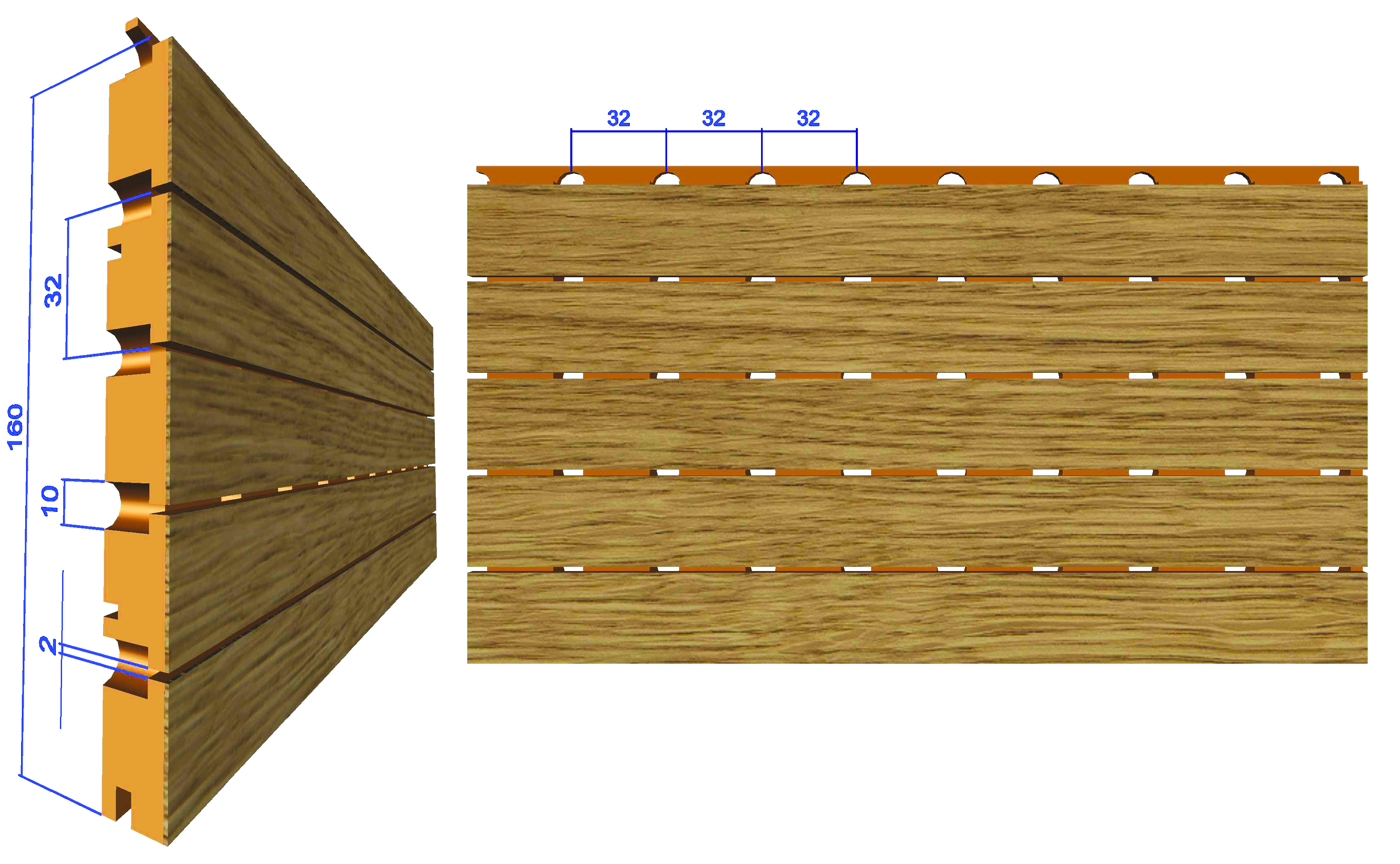 Base material: MDF, plywood or composite panels Panel size: 160x2400, 160x3000, 160x1500, 160x custom length Weight kg/m2: 7,29 Surface: melamine lamination , reall wood veneer, HPL Surface treatment: Standard WB coating , oil /wax coating, staining etc. Fire classification: up to B s1.d.0 , EU norm EN 13501-1 Humidity resistance: 70% standard to 95% Humidax Acoustical treatment: Acoustical fleece 155g/m2 Open area: 13,7% Suspension: Standard wood trims or Omega profile on 600mm axis -