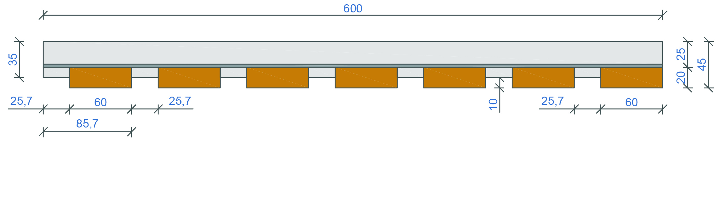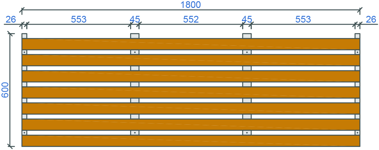 Base material: Real wood: Pine, Larch, Birch, Oak etc. Lath size (wx/hx): 60x20mm Sloted cross bar: 45x35mm+26x35mm No. of blades: 7 Element weight kg/m2: 6,80 Surface: Standard WB coating , oil /wax coating, staining etc. Fire classification: B s1.d0 , EU norm EN 13501- Humidity resistance: 70% standard to 95% treated Acoustical treatment: Rockfon Industrial mineral fibre pad 20mm or acoustical fleece 155g/m2 Open area: 30% Suspension: Standard plaster board studs or wood trims - direct mount
