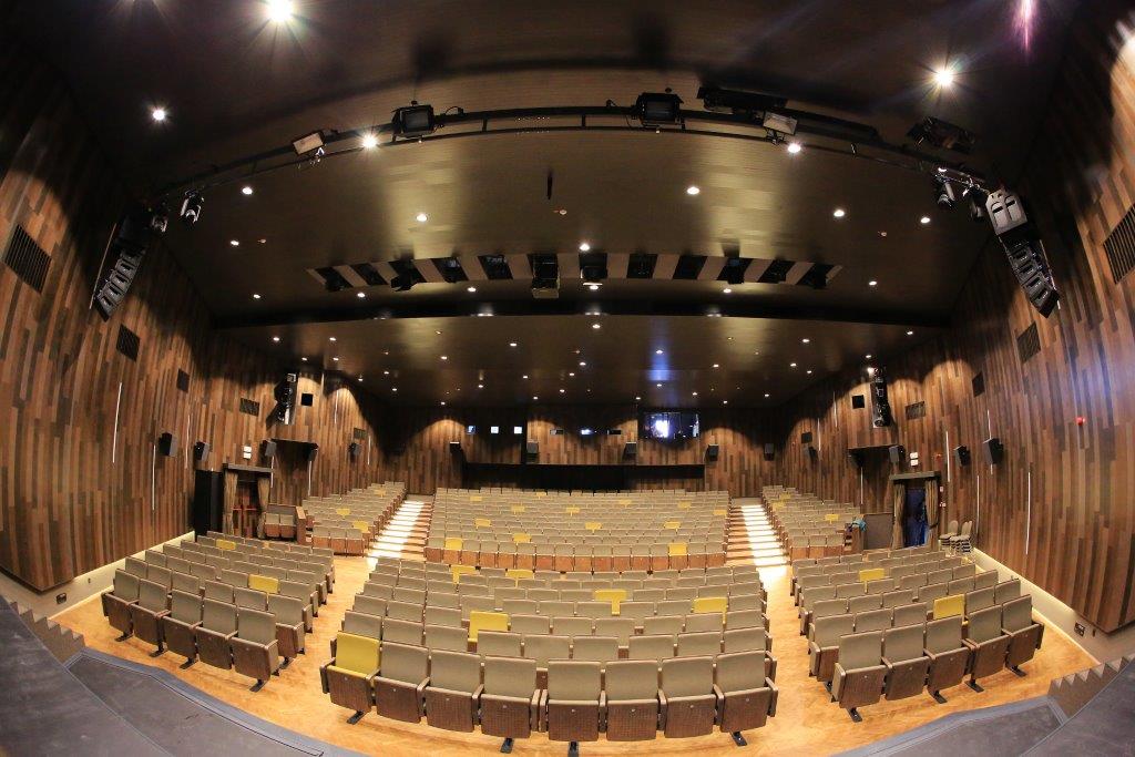 Concert hall in renovated cultural centre was finished with create full use of different length of planks Advance . In addition to dimensional variations architect applied several shades of walnut stain creating unique visual effect .